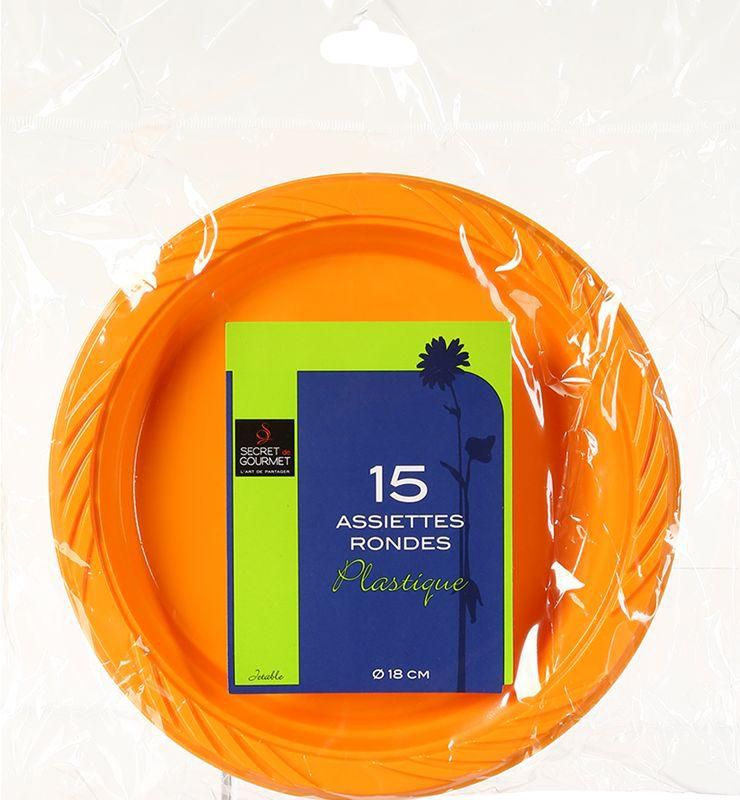 15 Grandes Assiettes en plastique Orange Assiette plastique Assiette Jetable Plastique Ronde Orange. Choisissez ce lot de 15 assiettes jetables en plastique pour vos décorations de fêtes. En Rupture 1,39 € - Matière Plastique. - Vendu par 15. - Couleur Orange - Dimensions Ronde 18 cm.