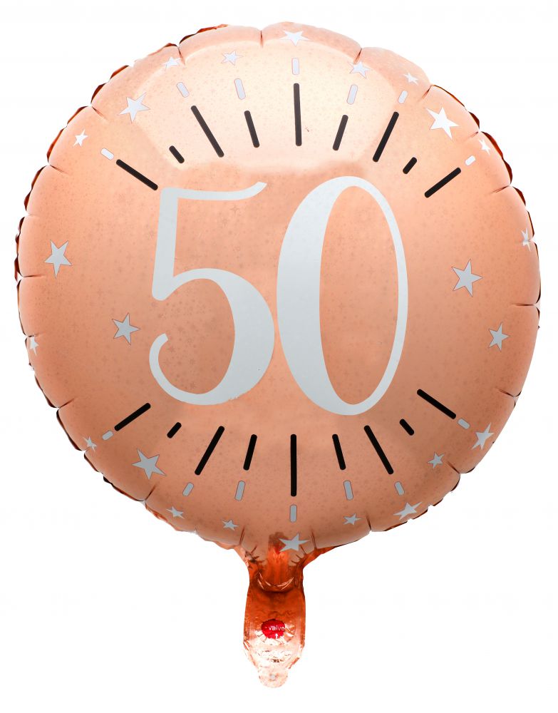 D45cm - 1pcsBallon aluminium rose gold de 45cm de diamètre imprimé 50 blanc. Gonflable à l'air ou à l'hélium longue durée. Livré avec paille.