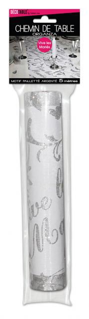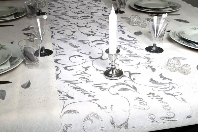 Complètement adapté pour l'occasion, ce chemin de table en organdi pailleté possède les inscriptions "Vive les mariés" !