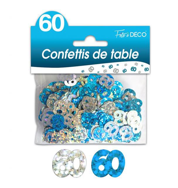 Confetti de table 60 ans Hologramme Bleu et Argent Confetti de table 60 ans Bleu et Argent En Rupture 1,99 € - Matière Papier Métallisé. - Couleur Bleu et Argent. - Dimensions 1.5cm.