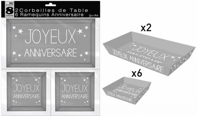 Constitué de 2 corbeilles de 27 x 14 x 4 cm et de 6 ramequins de 9 x 12 x 3 cm, cet ensemble gris très desgin harmonisera votre déco tout en la rendant encore plus festive. Ces petits plateaux cartonnés possèdent les inscriptions "joyeux anniversaire" ainsi que de petites étoiles blanches.