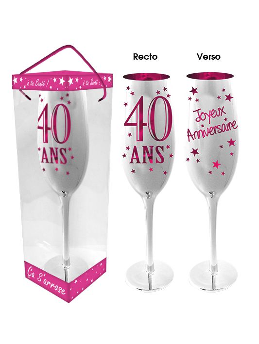 Envie de mettre la personne fêtée à l'honneur? Nous avons ce qu'il vous faut! Cette jolie coupe de champagne en verre chromé ornée d'étoiles et des inscriptions "Joyeux anniversaire" et "40 ans" en rose, vous est proposée dans son élégante boite à prix discount.
