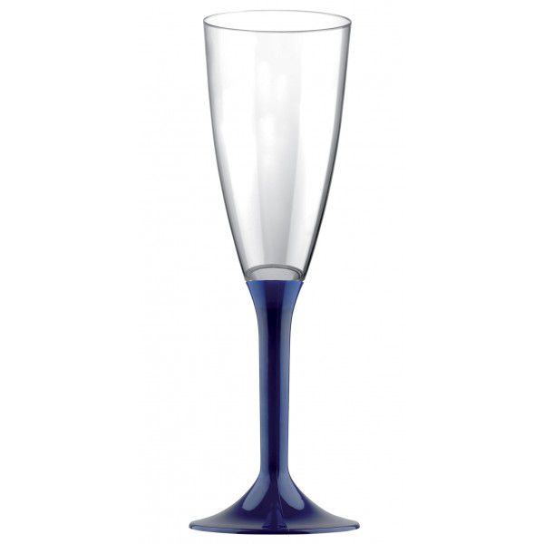 Plastique vendue par 10 pièces.Flûte en plastique rigide avec pied de couleur bleu marine d'une capacité de 15 cl.