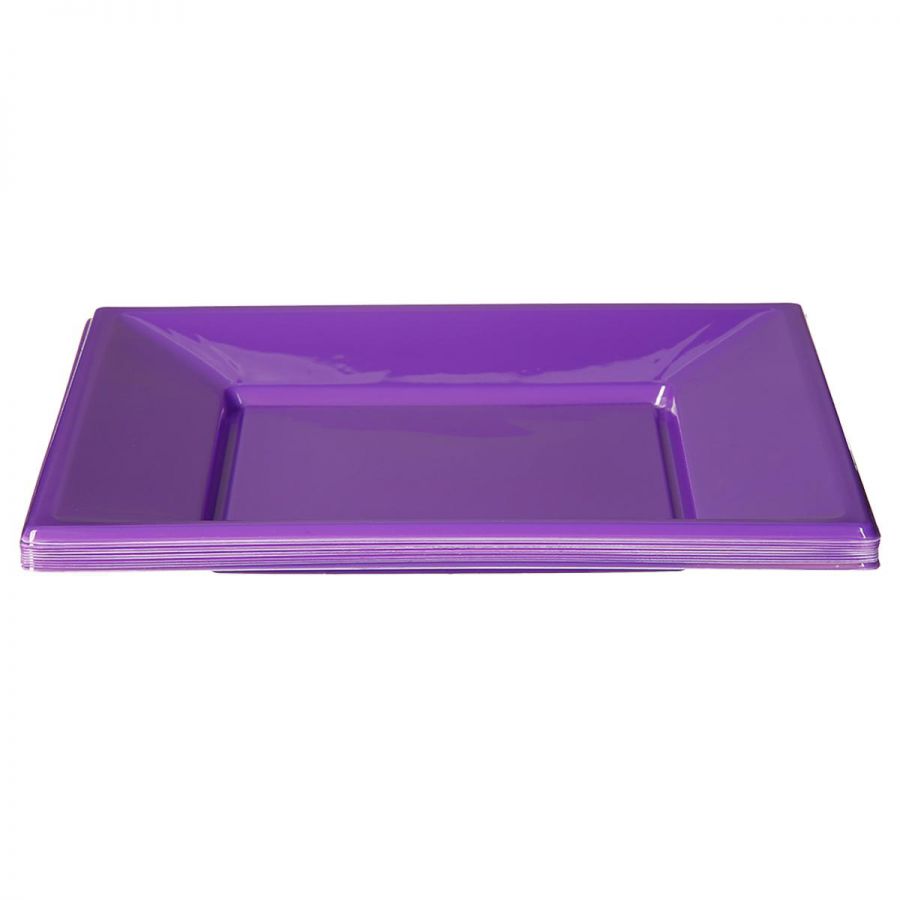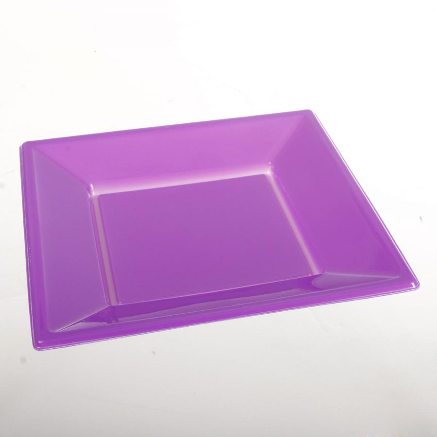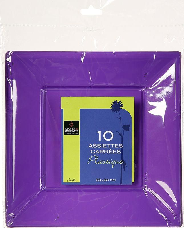 Nos assiettes jetables sont en plastique et vendues en sachet de 10 pièces. Elles mesurent 23 cm par 23 cm et sont carrées.