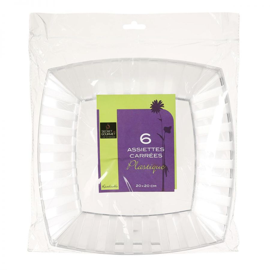 Vendue en lot de 6 pièces, nos assiettes en plastique transparentes mesurent 20 x 20 cm et sont en plastique rigide, vous pourrez sans problème les laver à la main et les réutiliser.