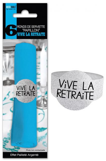 Carton - Par 6 piècesRond de Serviette Vive la Retraite pailleté argent.