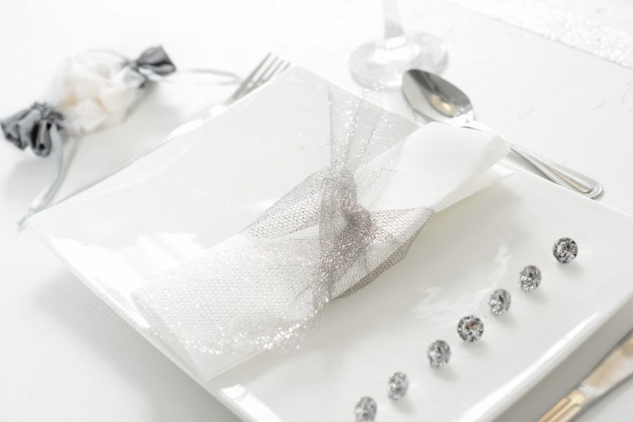 Faites de jolies choses avec notre ruban tulle blanc à paillettes argentées.