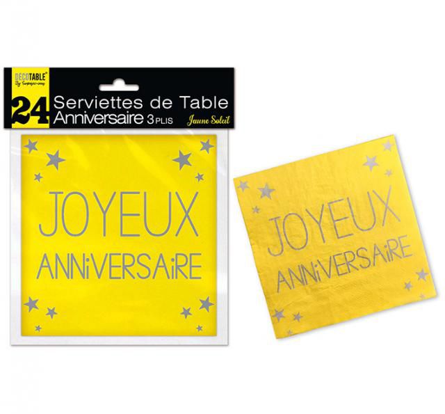 Serviette Anniversaire 3 plis Jaune Papier - 33x33 cm - 24 pcs Serviette de table Anniversaire Jaune Soleil. En Rupture 2,39 € - Matière Papier - Dimensions 33cm. - Couleur Jaune. - Vendu en lot de 24.