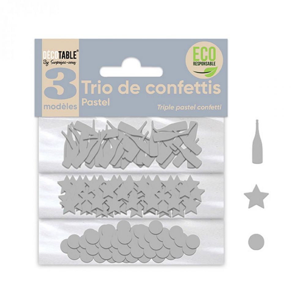 Trio de Confettis Gris en papier ECO Responsable En Stock 3,29 € AJOUTER AU PANIER Dimension d'un confetti 1 cm Couleur Gris Pastel Conditionnement vendu au sachet
